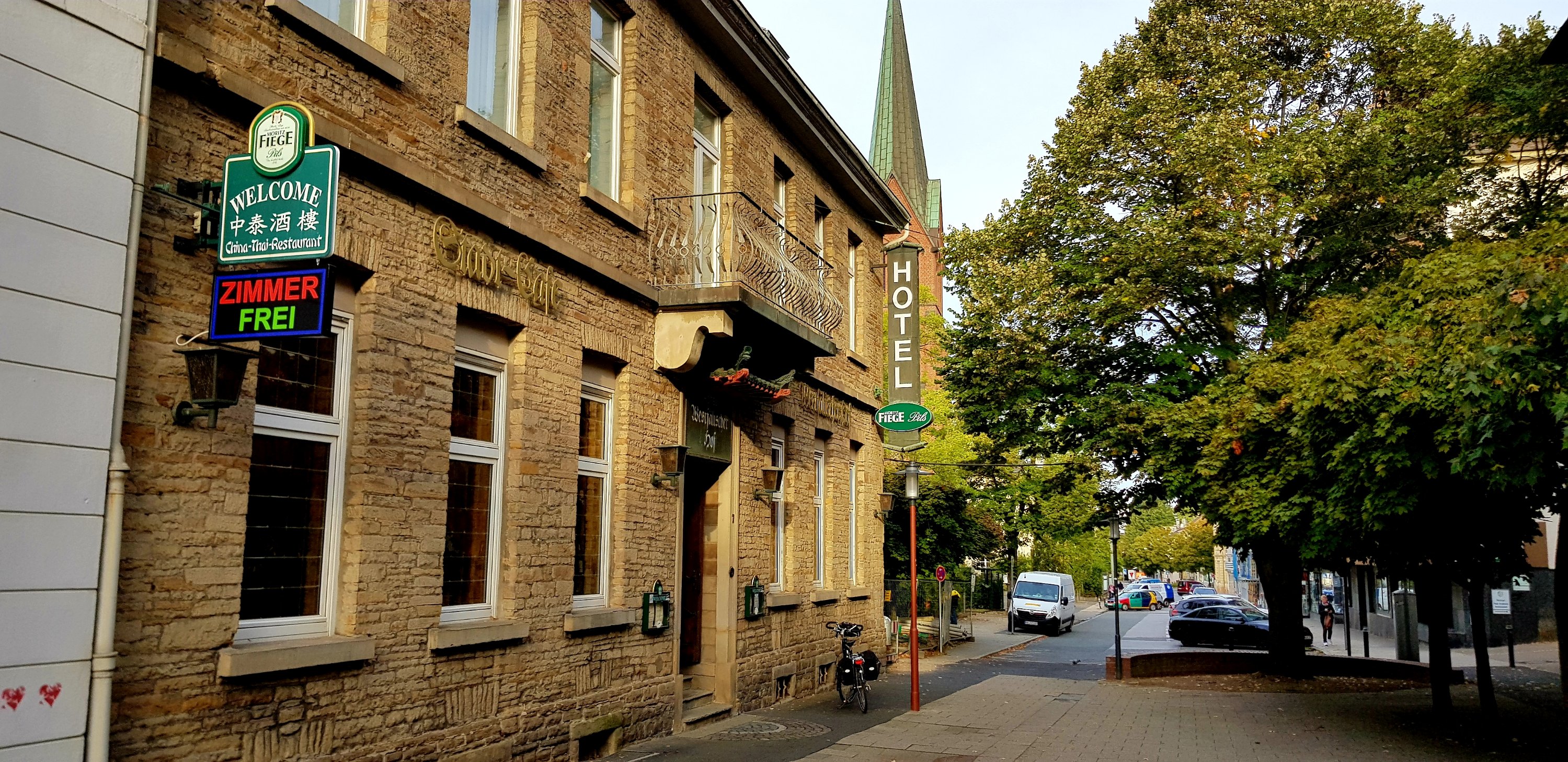 De norse stem zegt, desgevraagd, dat in Hattingen im bahnhofstrasse een hotel is. Deze stond niet op booking…. ik zoef weer het oude stadje in. Direct zie ik de straat… en ja het hotel een stuk verderop. Een Chinees restaurant met zimmer frei aan de gevel. De deur staat open, doch in de portiek is alles dicht en donker. Gelukkig doet een kleine Chinese vrouw open. Ze spreekt Duits met Chinees accent. Ze heeft een kamer. Ik moet twee keer vragen naar de prijs. Sjeksundenvlierzig eujro. Da’s geen geld. Ik kijk verbaasd en pak mijn telefoon en mompel sind da noch andere hotels in die nähe? Snel zegt ze met ontbijt! Maar toch wel met een ei? Zeg ik. We moeten beiden lachen. Ze hoort dat ik aus Holland kom. Het blijkt een echt ‘bikers hotel’ te zijn. De fiets gaat in de kelder en er zijn nog 2 holländer, auch mit fahrrad vertelt ze. Het meeste ontgaat me. Na elke zin lacht ze voluit.