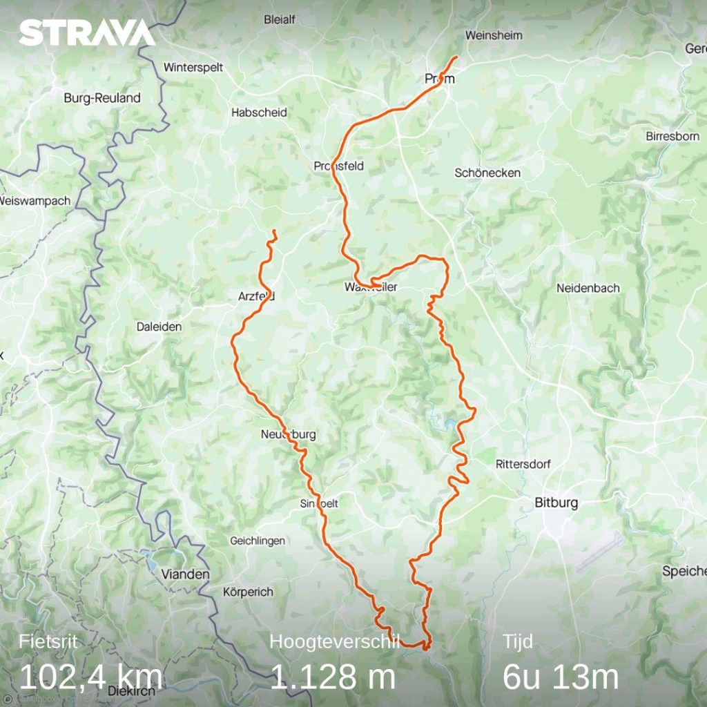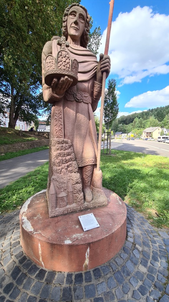 Ik rij voor 9 uur weg en het gaat kilometers lang naar beneden op het Enz-fietspad. In Holstrum is het keerpunt: langs de Prüm naar het noorden. Hier begint het echte klimmen. Tot Waxweiler blijft het heuvel op en af. Hierna een oud treintraject dat zorgt voor een snelle verbinding naar Prüm, waar Keizer Lothar langs de route, achter de Basiliek de nieuwkomers begroet.