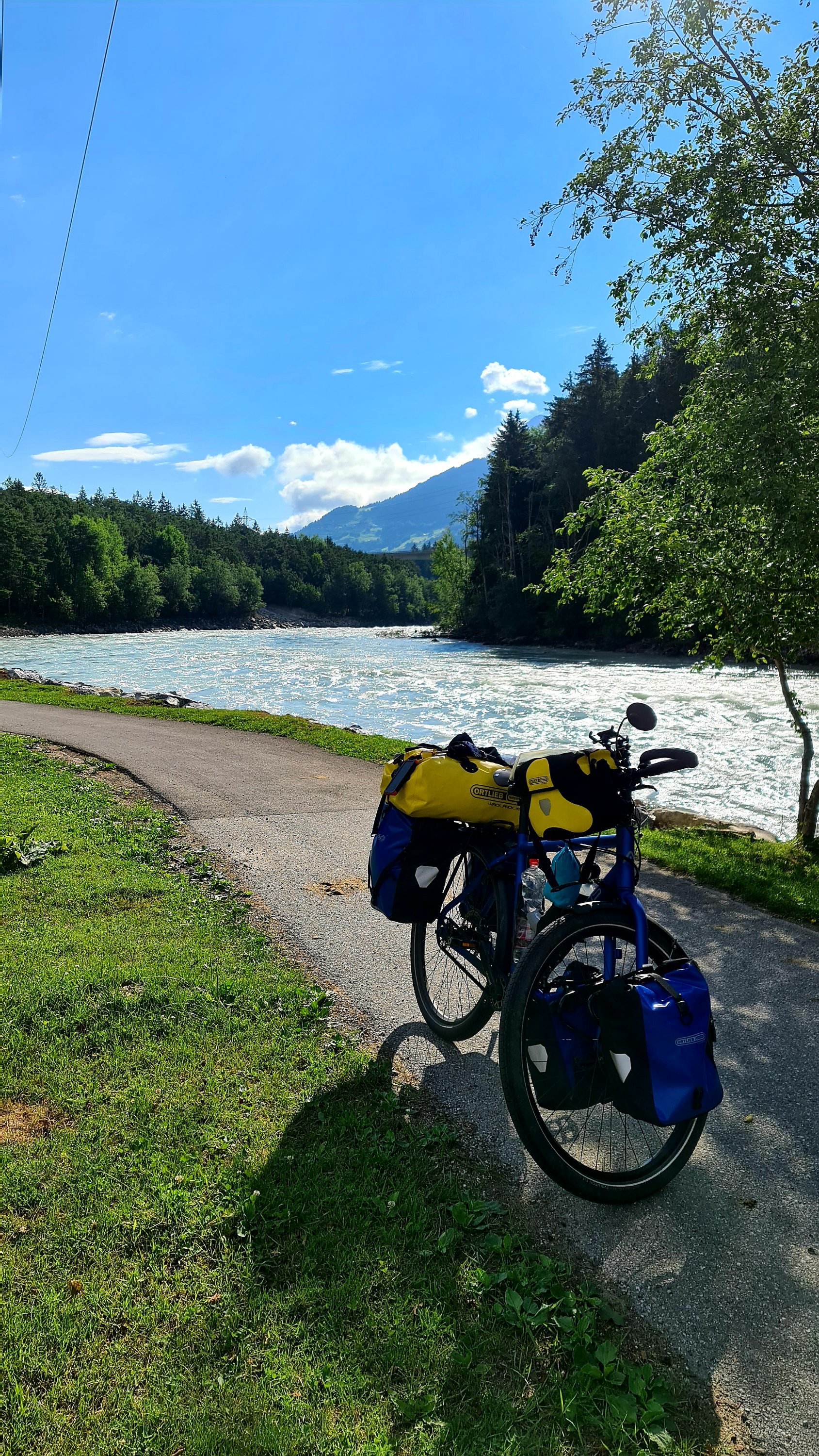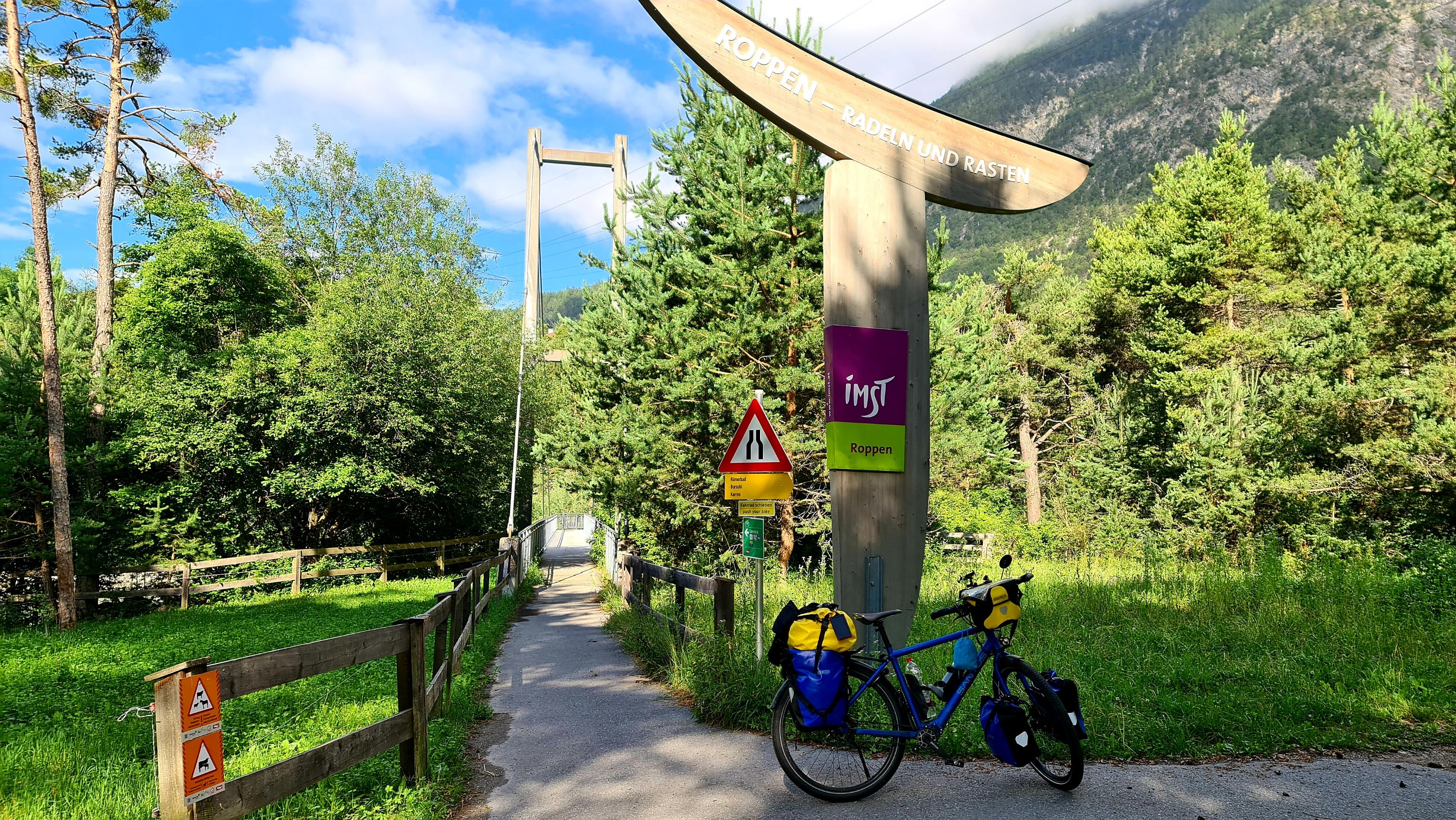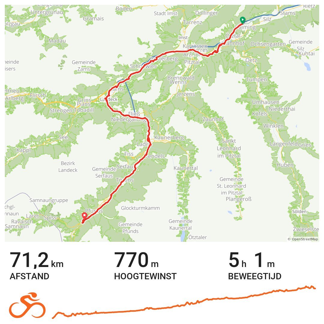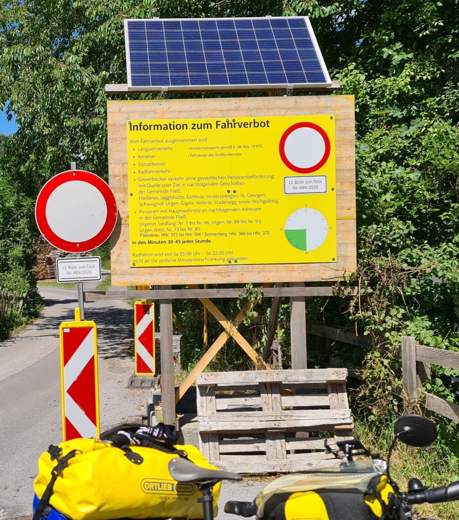 Zoals je ziet is het een opmars naar morgen, een gestage klim naar de Italiaanse grens, hoog in de Alp. Het is alweer de laatste Oostenrijkse dag. En omdat te benadrukken word ik net na Landeck staande gehouden door de Polizei op een smalle bosweg. Weet u dat u nú niet mag fietsen. Nee, hoezo, ik rij een route, waarom niet? Ik herinner me de reeks borden boordevol teksten wel, maar was er al voorbij voor ik er erg in had. Om het half uur mocht het verkeer van noord naar zuid en andersom. Dus u gaat nu terug, wacht 15 minuten of u gaat lopend 2 km tot het dorp. Oh ik wandel wel… ze hadden gelijk, er moest regelmatig een auto langs. En met heuvels fiets je dan met hoge snelheid zonder uitwijk mogelijkheid. Soms heb ik een beetje gesmokkeld, stapvoets. We blijven Hollanders, met umlaut.