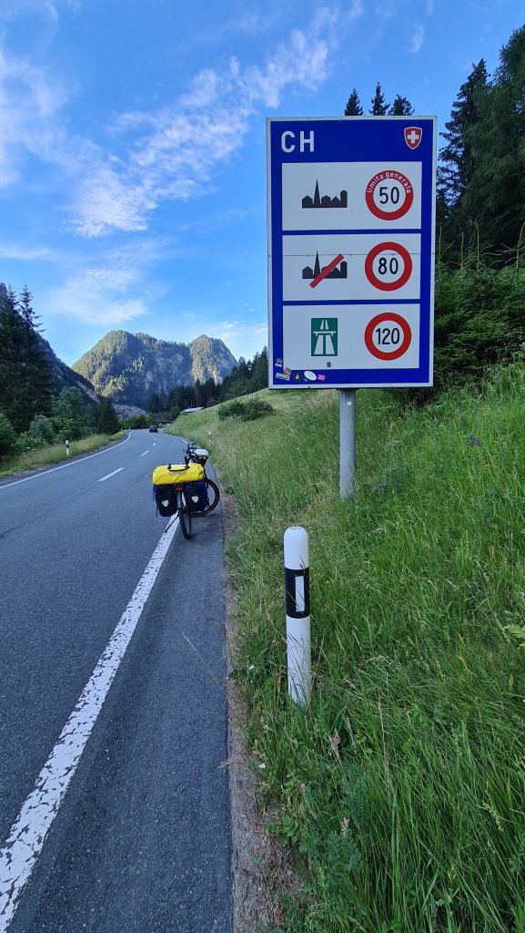 Een afdaling en dan naar Reschen. De pas stel weinig meer voor. Maximaal 3% en de Italiaanse grens over, waar men de fietsers geruisloos laat passeren. Anders is het voor het autoverkeer, een lange file tot gevolg.