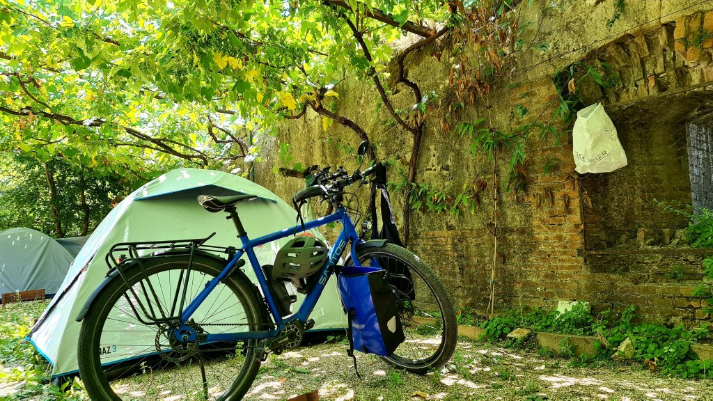 En zo verruil ik het camperen onder de olijfboom, voor de wijnranken. Zij vormen een bijna gesloten dek op dit tentenveldje.