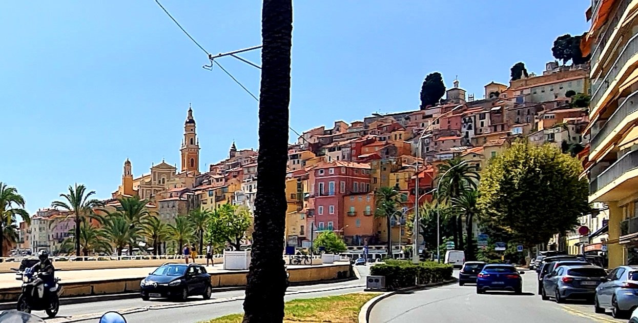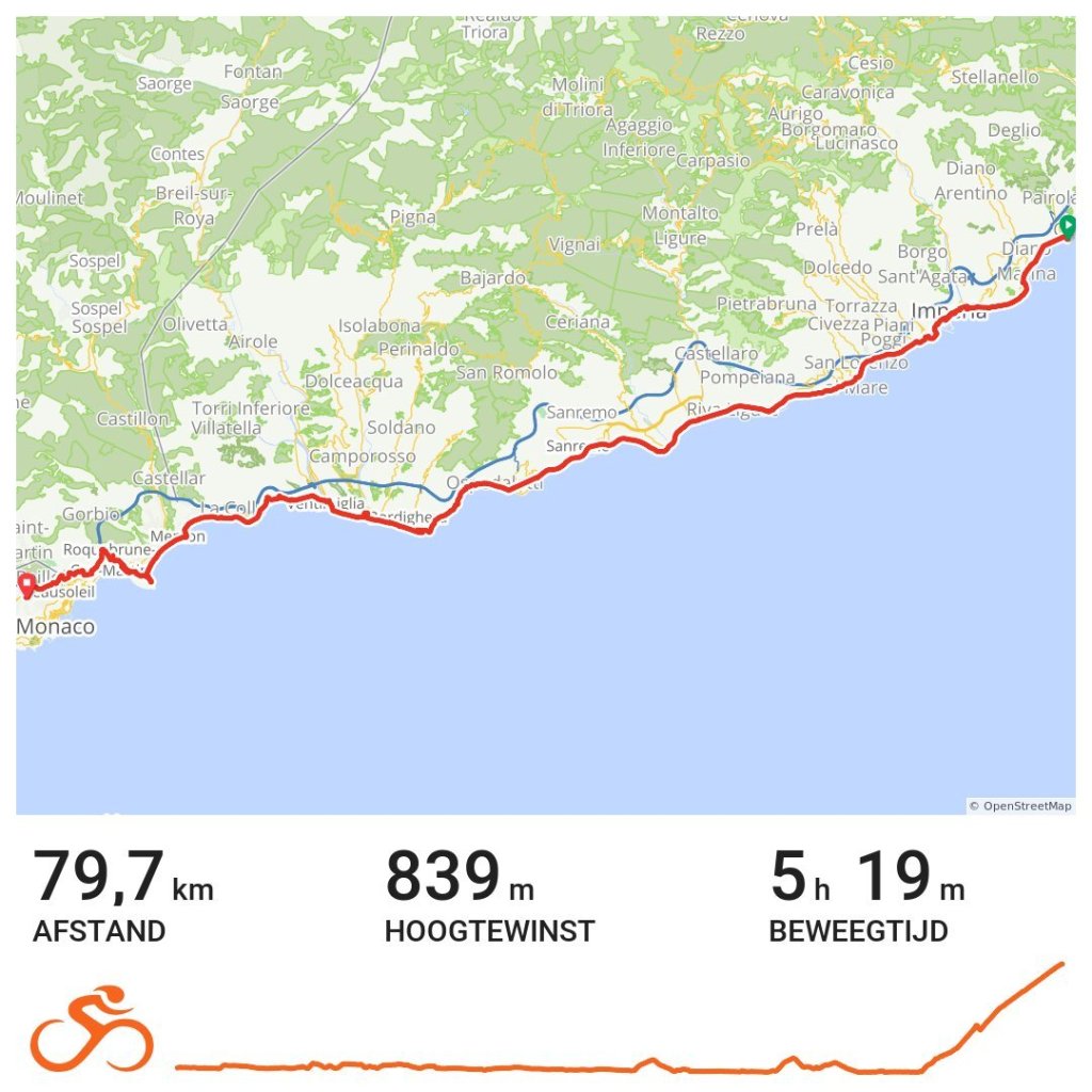 De grens, confine di stato volgt na wat klimmen en dalen. Frankrijk. Eerst de oude badplaats Menton daarna omhoog de Grande Corniche op, met prachtige uitzichten op Monaco. De klim is ruim 8 % en na 15 kilometer begin ik steeds vaker te verlangen naar de afdaling naar Nice.