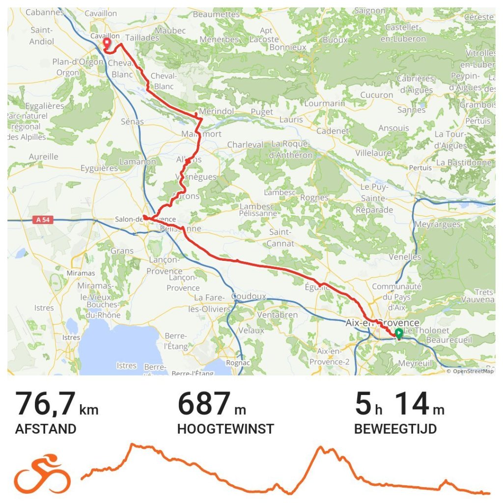 Het is een dag waarin het landschap verandert. Minder wijngaarden, minder bos. Het is een bijna lege vlakte, terwijl ik tegen het bergmassief aankijk. De Luberon. Op het naderen van Cavaillon komt er weer meer hoge begroeiing, terwijl de harde wind doorblaast.