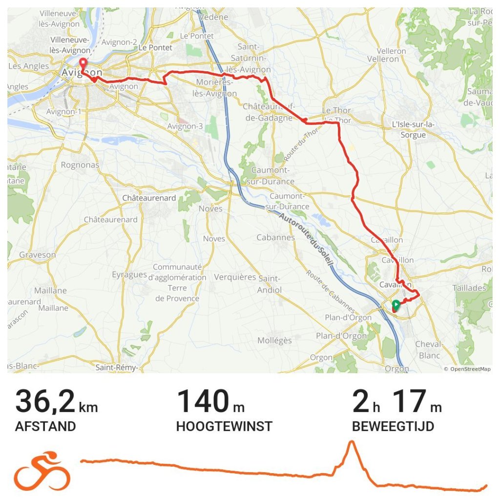 Avignon heeft vanuit haar buiten steden een goede fiets infrastructuur. Op de hekjes na fiets ik makkelijk, slalommend de stad in. Prachtig! Een waardig einde van de 380 km lange fietstocht door de Provence. Morgen begint de Vuelta, richting Spanje.