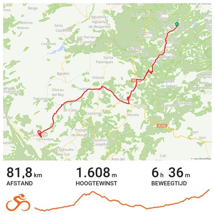 ik stop in Morella, voor een broodje en loop met de fiets aan de hand door dit unieke dorp. Het ligt als een adelaarsnest, net zoals Cantavieja hoog op een rots. Ach ja, ik klim er wel naar toe. Maar nu in Cantavieja om er te rusten, te eten en terug te kijken op een prachtige fietsdag.