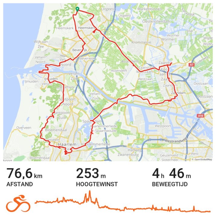 De start op deze eerste dagroute van het jaar ligt op camping Noorddorperbos, tussen Castricum en Heemskerk. De website van de camping vermeldt: Vanaf de camping mooie fietsroutes door duin- en polderlandschap. Ik wil vandaag de regio Zuid-Kennemerland en IJmond verkennen en via een stukje Zaanstreek terugkeren naar Heemskerk. In totaal zo’n 80 kilometer Noord-Hollandse glorie en folklore en dat is ook voor een fiets zonder hulpbron goed te doen. Maar je kunt de route ook delen, bijvoorbeeld als je komt per trein. Haarlem ligt ongeveer op de helft. Je kunt eventueel de route met 10 kilometer verkleinen door niet over het sluizencomplex in IJmuiden te fietsen maar het veer te nemen tussen Velsen noord en zuid.
