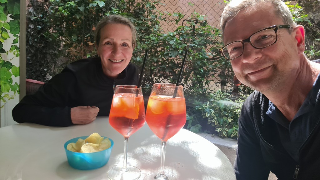 Het is lekker klimmen na Carsoli, de provincie Rieti uit. Sommige borden verwijzen nog naar de oude naam Sabina: de Sabijnen hadden hier hun leefgebied, voordat de Romeinen hen onderworpen. Ik rij de provincie L’Aquila en de Abruzzen in. De genoemde bergpas op. Na km paal 86 gaat het snel omlaag het drukke Tagliacozzo in. Er is markt, die op z’n end loopt. 2 km verder is de camping, Ingrid was ook net aangekomen. We mogen de camping pas na 4 uur op. Dus pakken we de fiets Tagliacozzo in voor verjaardagsgebak met Aperol Spriz.