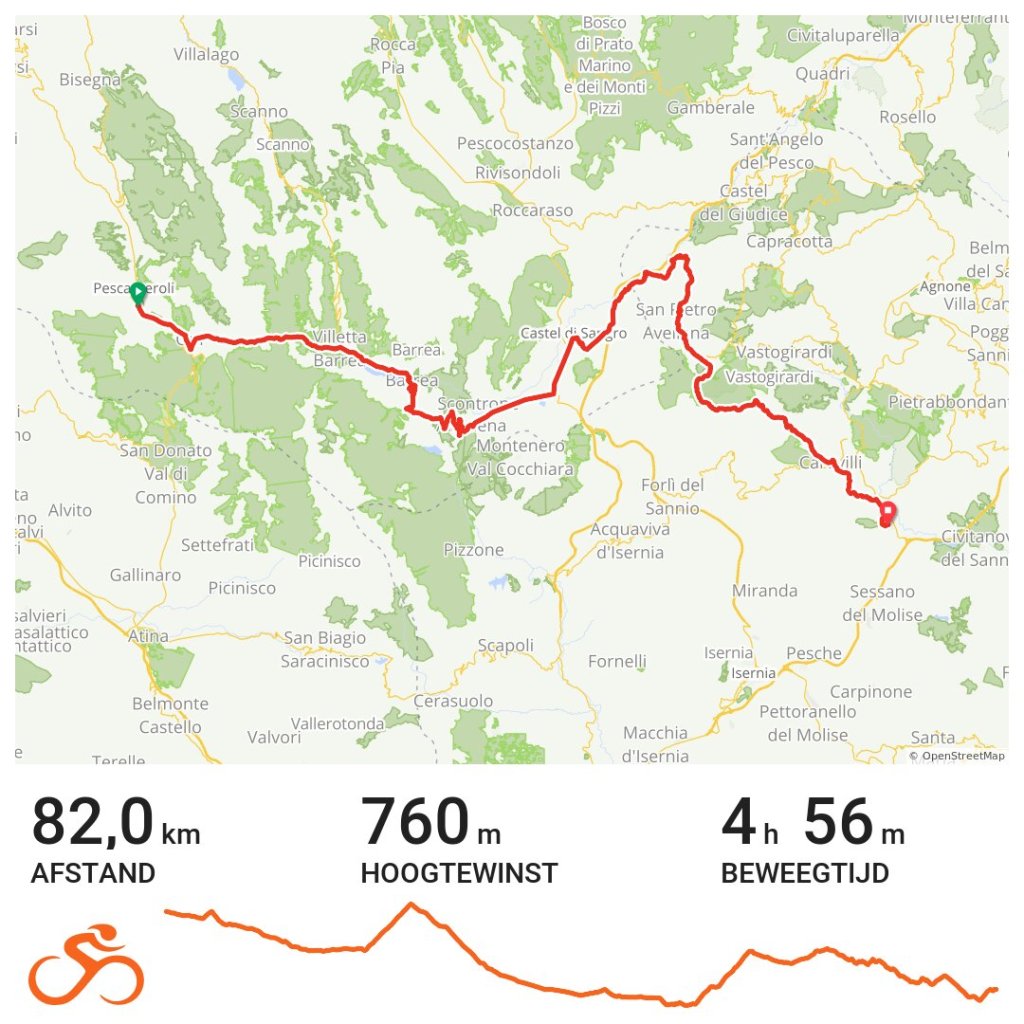 Verder de regio Molise in. De op een na kleinste regio van Italië. De ruwe bergen laat ik achter me, het gaat nu minder hoog en laag, maar het blijft vriendelijk op en neer gaan door uitgestrekte bossen. In Pescolanciano is een camper parkeerplaats. Zeer verzorgd, met water en elektra. En het is zowaar droog. Na een paar minuten komt Ingrid aanrijden, de luifel gaat uit en de kachel aan.