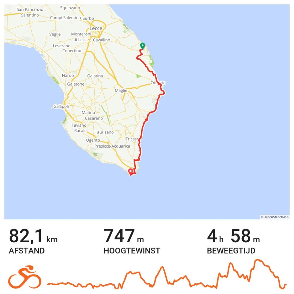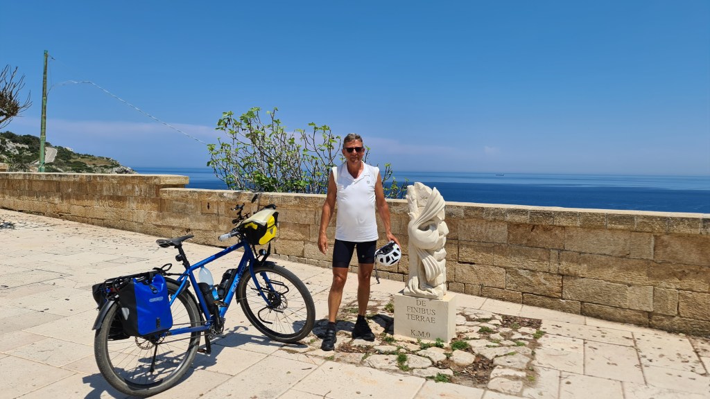 De route eindigt op de kaap, het hoofd van de hak steekt brutaal in de zee. Waar de Ionische en de Adriatische zee in elkaar stromen. Niet dus alleen het einde van de route, ook die van het Italiaanse vaste land. Hier op het meest zuidelijke punt, net daarvoor staat de een na grootste vuurtoren van het land. Hier zou apostel Paulus aan land zijn gekomen; Een grote kerk, een groot plein. Deze plaats voelt veel meer als het eindpunt. Van het hart van Italië naar de hak. Een mooie tocht van bijna 1.200 km. Apuglie is een regio die het waard is om bezocht te worden.
