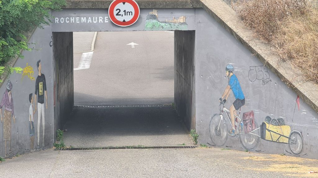 Aangenaam is de onderbreking voor Rochemaure. Ik moet via een hangbrug over de Rhône. Deze is alleen voor wandelaars en fietsers. Als je alle waarschuwingen leest, durf je niet meer. Als de mistral aan staat dan beweegt hij mee met de wind.