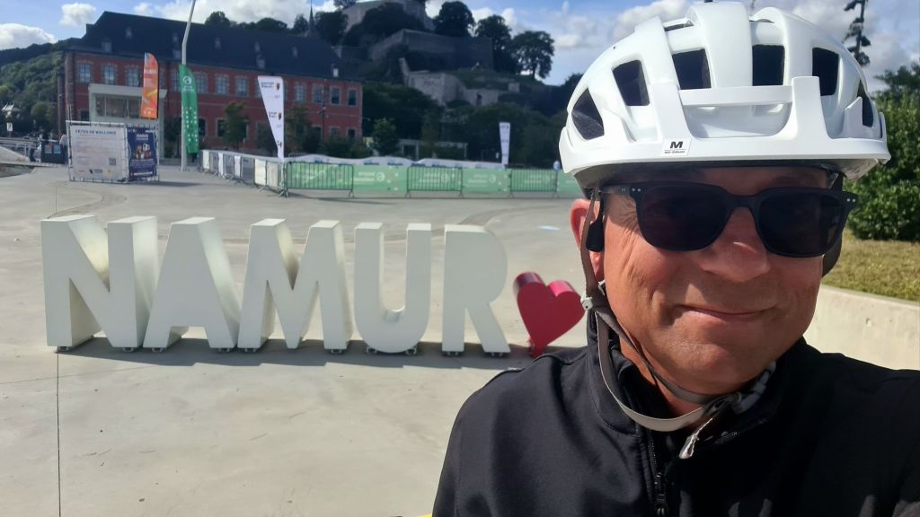 Maar alles gaat goed. Heet water voor de koffie en de Lidl heeft brood enzo. Na een paar km ben ik in België. Dinant, Namen en nu in Hoei zijn de belangrijkste plaatsen vandaag. Voor de rest is het de RAVeL volgen. Niet overal autovrij of gemakkelijk. Voor Dinant zijn er wegwerkzaamheden waardoor ik via een trap naar de overzijde moest. Er was wel een rail waar de band in moest, maar veel te stijl en te weinig ruimte voor de tassen. Een vriendelijkheid Waal hielp met het tegenhouden van de fiets, zodat we het er allemaal heelhuids vanaf brachten.