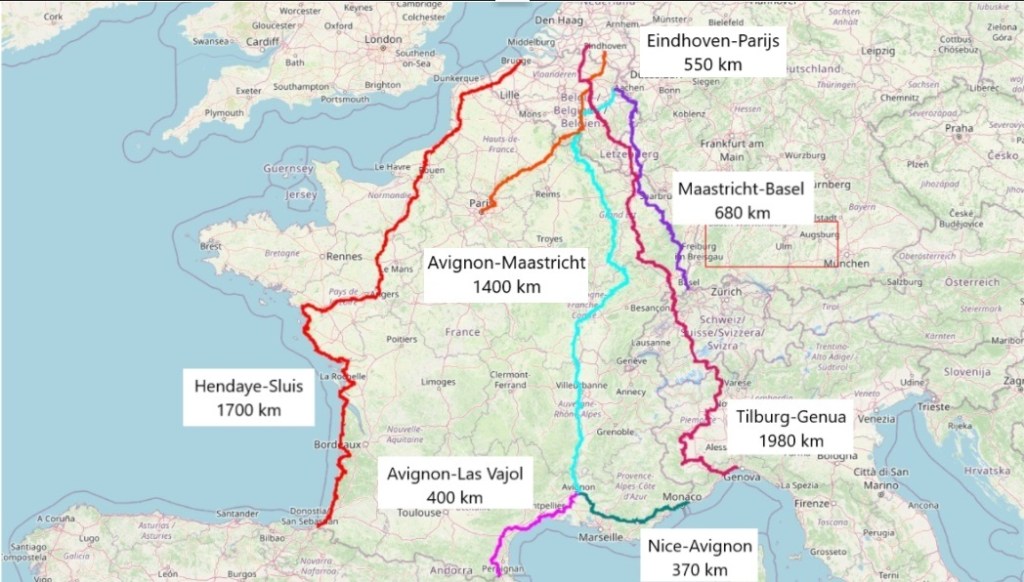 - Door het binnenland – o.a. Groene Weg naar de Middellandse Zee, Midden Frankrijk Route en combinaties via Maas, Moezel en Vogezen.