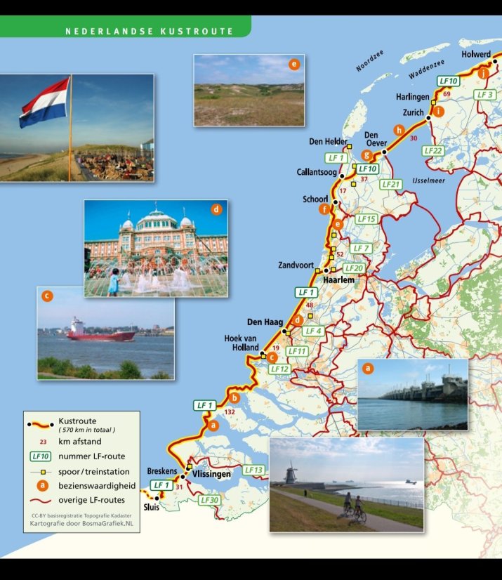 De Nederlandse Kustroute is een thematische LF-route en loopt van Vlissingen naar Bad Nieuweschans in Groningen. Ik rij deze route tot Schoorl en dan via Alkmaar naar Amsterdam. Deze LF 1 kenmerkt zich vooral door langgerekte duinstroken langs de Hollandse kust en Zuid- Hollandse en Zeeuwse eilanden.