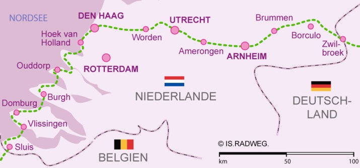 De route wordt van west naar oost gereden en start in Den Haag, Utrecht of Arnhem. Maar ook Zutphen kan. Leidraad is de EV2, die conform de Duitse R1 en de Nederlandse LF4 en het laatste stuk LF8 naar Zwilbroek/Zwillbrock in Duitsland gaat. De EV2 is overigens niet bewegwijzerd, we moeten het doen met de regionale verbindingsborden. Ditzelfde geldt ook voor de EV3. En wil je westelijker starten dan kun je bijvoorbeeld vanuit Den Haag of Utrecht de LF4 volgen.